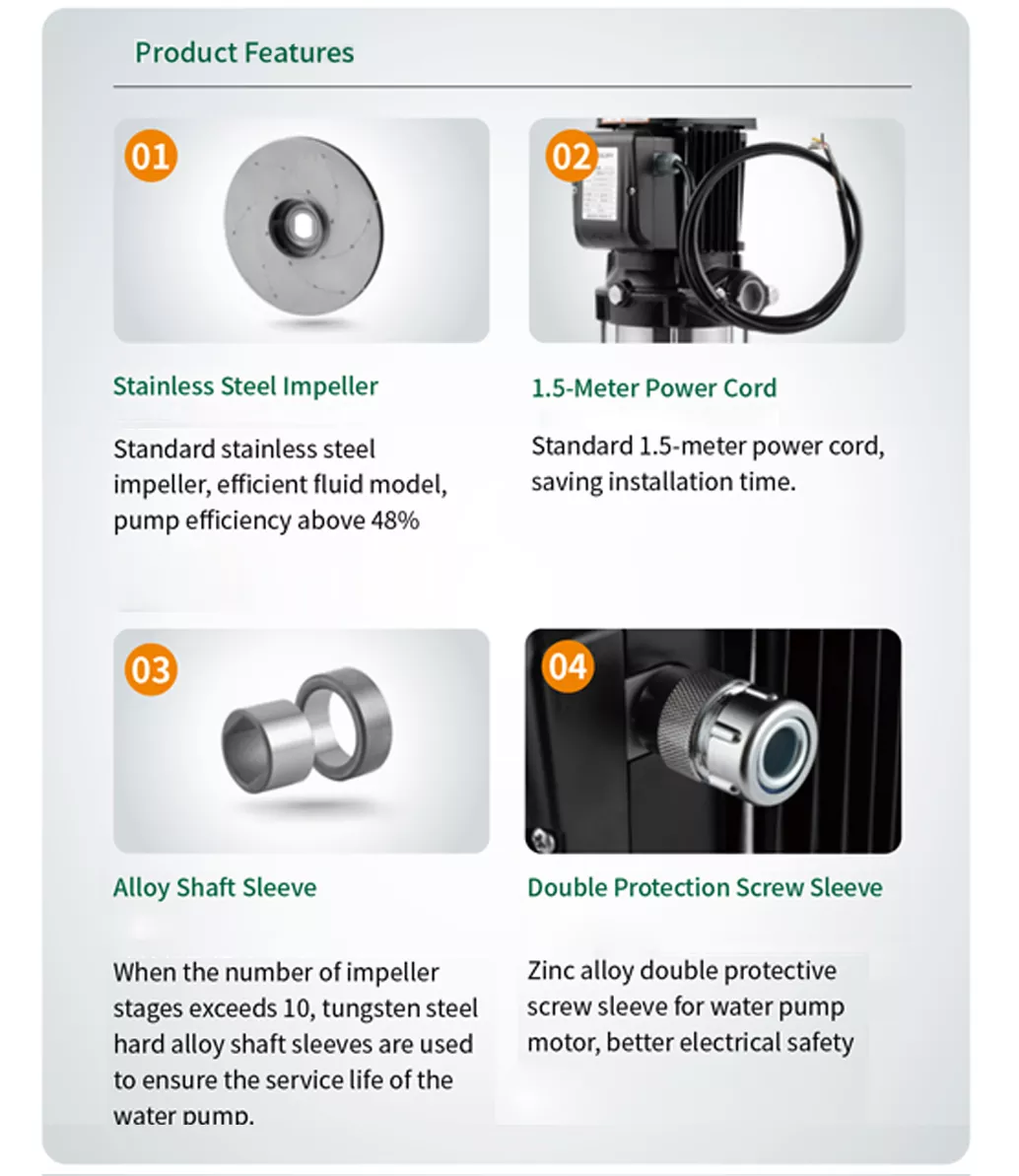 Kepala pompa dapat diatur dengan mengubah jumlah impeler untuk memenuhi berbagai kebutuhan. Cocok untuk air bersih atau cairan dengan sifat serupa, sedangkan model tertentu dapat disesuaikan untuk media korosif.